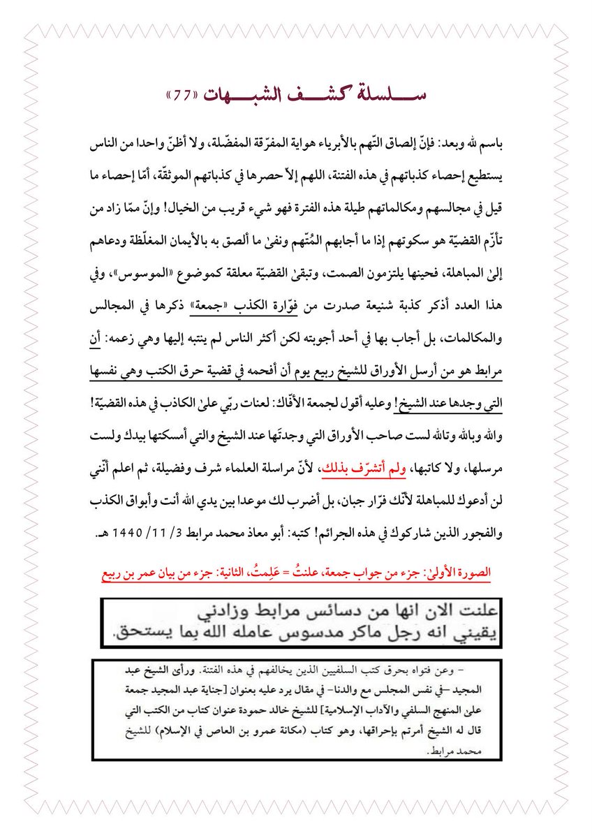 موقع التصفية والتربية الآن على منتديات التصفية والتربية العدد 77 من سلسلة كشف الشبهات وهو عدد خاص بـ جمعة الكذاب كتبه أبو معاذ محمد مرابط وفقه الله الرابط Https Www Tasfiatarbia Org Vb Showthread Php T 24064