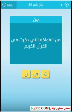 اجابة لغز من الفواكه التى ذكرت فى القران الكريم من اللغز رقم 56 من لعبة رشفة للمجموعة السا صقور الإبدآع